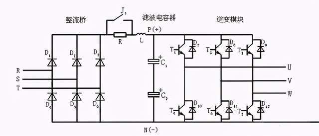 变频器缺相故障维修是常见的故障之一,要知道变频器产品中主要有单相220V与三相380V的区分,当然输入缺相检测只存在于三相的产品中。图1所示为变频器主电路,R、S、T为三相交流输入,当其中的一相因为熔断器或断路器的故障而断开时,便认为是发生了输入缺相故障。