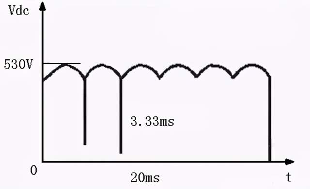 当变频器不发生缺相的正常情况下工作时,Udc上的电压如图2所示,一个工频周期内将有6个波头,此时直流电压Udc将不会低于470V,实际上对于一个7.5kW的变频器而言,其C的值大小一般为900uf,当满载运行时,可以计算出周期性的电压降落大致为40V,纹波系数不会超过7.5%。而当输入缺相发生时,一个工频周期中只有2个电压波头,且整流电压最低值为零。此时在上述条件下,可以估算出电压降落大致为150V,纹波系数要达到30%左右。