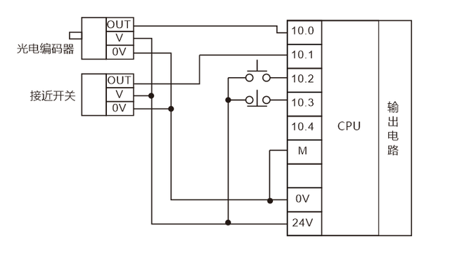 直流有源输入输入信号一般都是24V,这类信号与其他无源开关量信号混合接入PLC输入点时电压的0V点一定要接。上图输入点I0.0,I0.1连接光电编码器,接近开关的输出OUT信号,它们的驱动电源由PLC自身的24V电压提供
