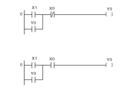 I/O分配SB0-X0,SB1-X1,输出K0-Y0。当外部使用长闭触点,不操作该按钮,输出Y0正常接通,在PLC控制系统中,外部开关无论是启动还是停止一般都选用常开型。