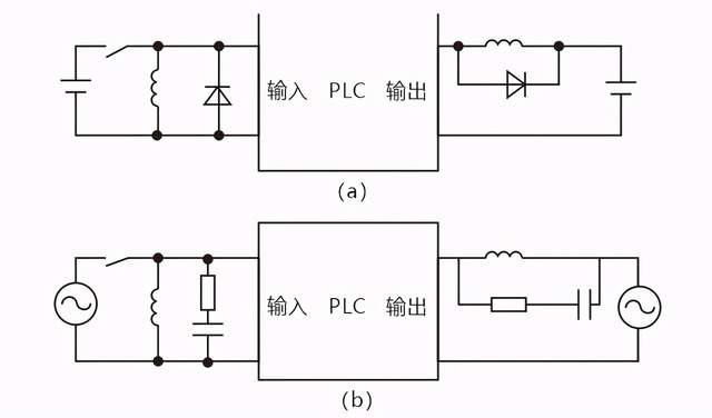 当PLC输入输出端接有感性负载元件时,直流输出的续流管保护(直流电路两端并联续流二极管),交流输出阻容吸收电路。