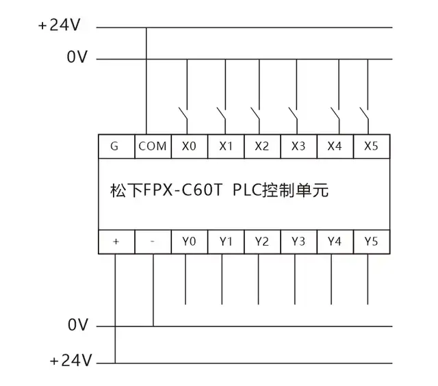 图中松下PLC为直流汇点式输入,即所以输入点共用一个公共端COM,同时COM端内带有DC24V电源,在编写程序时注意外部设备使用的是常闭还是常开触点