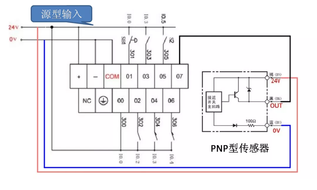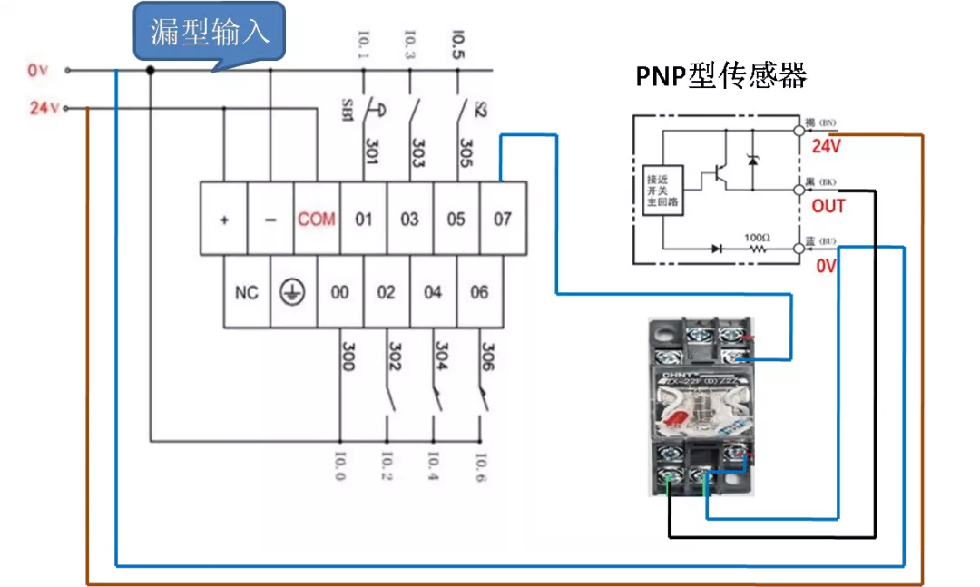 图10 PNP型传感器与PLC实物接线 对于PNP型输出的传感器接入到PLC的输入信号端时,公共端M就必须要要接低电平(即电源的0V),此时PLC输入端接法应接为漏型接法。(如图10所示)