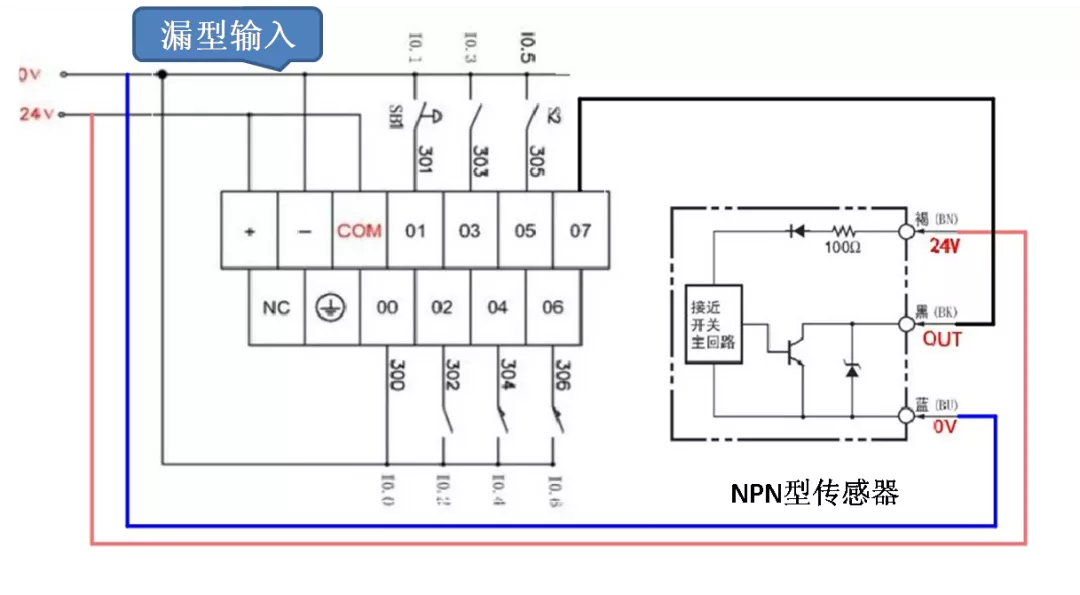 图8 PLC漏型输入 当电流经过外部开关,从模块的通道流入,再经过内部电路,从公共端流出的接线方式,称为漏型输入,电源负极作为漏型输入的公共端作。(如图8所示) NPN和PNP型传感器与PLC连接