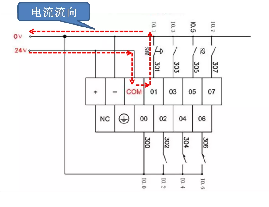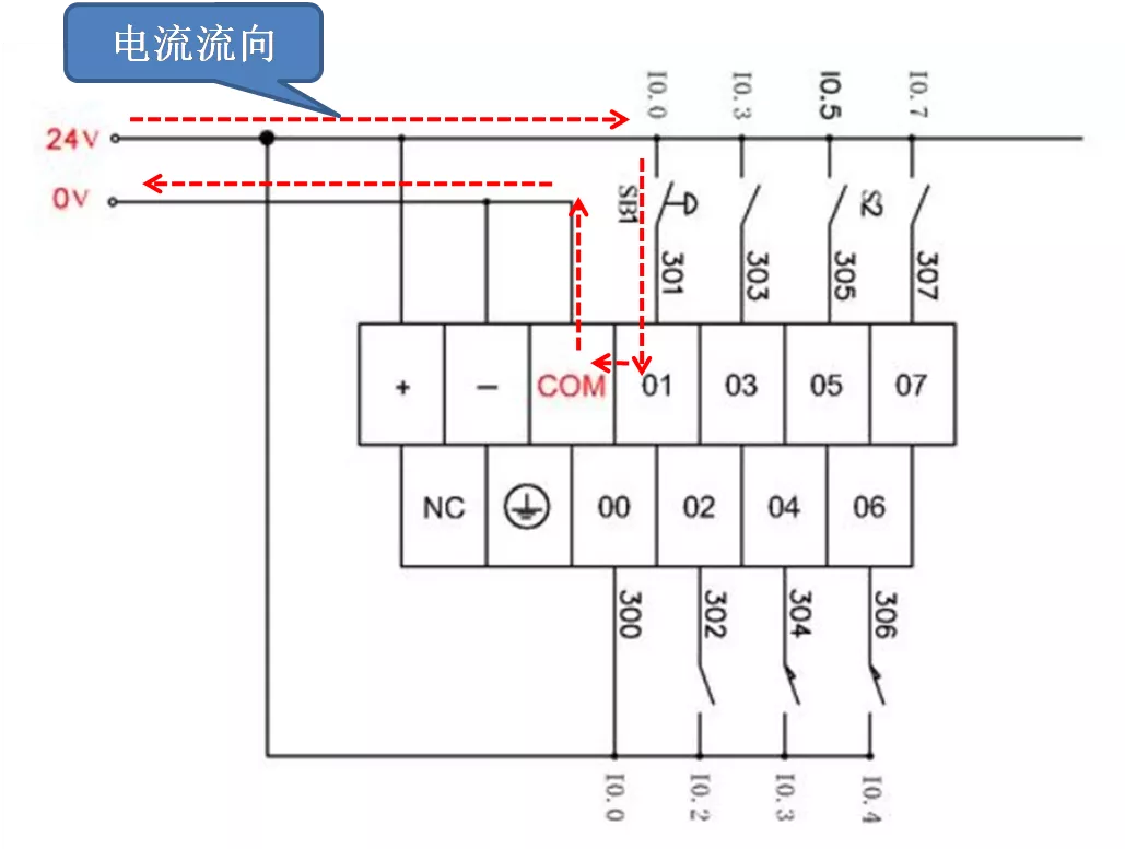 图7 PLC源型输入 当电流从模块的公共端流入,从模块的输入通道流出的接线方式,称为源型输入,电源正极作为源型输入的公共端。(如图7所示)