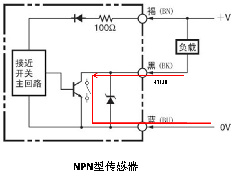 当控制负载时,其电流走向是:24+--流入负载---从负载流出流入传感器out端---传感器0V端---0V,电流是从传感器out端流入。(如图4所示)
