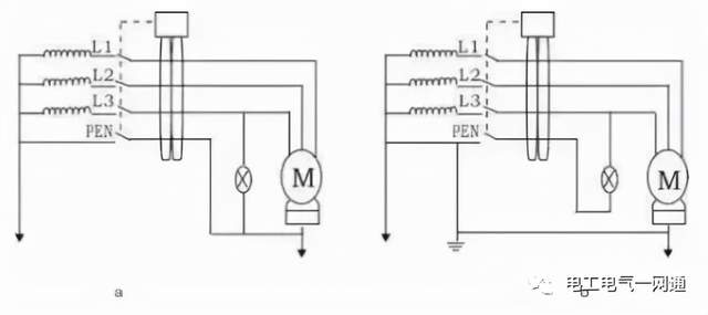 电气设备具有保护接零线路中,安装剩余电流动作保护器时,若误将保护接零导线穿过零序电流互感器,将使电气设备的剩余电流无法被检测出来,造成剩余电流动作保护器拒动,如图6-1 a,正确接线见图6-1 b。