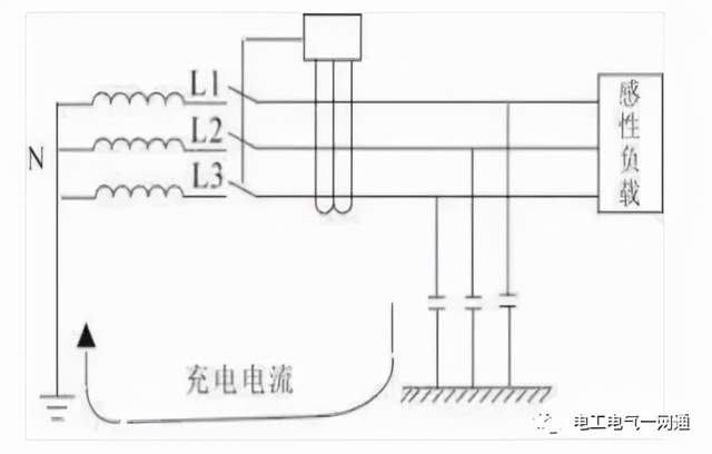 在低压电网中,由于变压器、电动机的磁饱和特性的影响,以及使用大功率的整流器、晶闸管、电弧炉、气体放电灯等都会产生高频电流。当供电线路长、对地电容大时,高频电流对地的漏电就会引起剩余电流动作保护器的误动作,见图6-7。