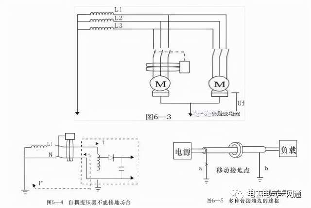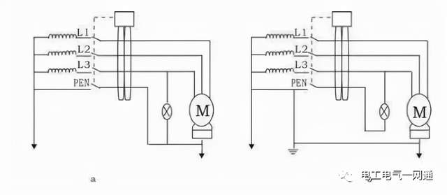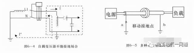 在6-2a接法中,由于零序电流互感器后面对工作中性线实施了重复接地,这样使一部分工作电流通过重复接地极流入大地而造成剩余电流动作保护器的误动作,而当电气设备发生漏电故障时,漏电电流则又可能通过工作中性线回流,使零序电流互感器检测不出漏电故障信号,使保护器不动作,正确接线如图6-2b,将重复接地点移至零序电流互感器的前面。