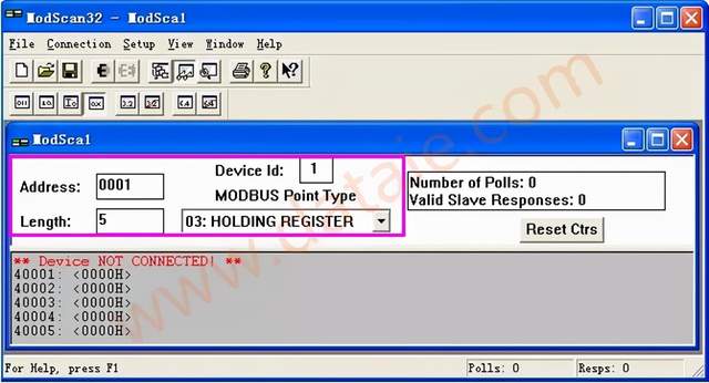 图10 建立ModScan连接 选择“File”→“New” 打开ModScan通信界面,设置Modbus RTU从站的地址Device Id=1,数据开始地址Address=0001,数据长度Length=5,Modbus数据类型功能码03,如下图11所示: 注意:Device Id设置必须与“MB_SLAVE”指令中输入引脚“MB_ADDR”设置的地址一致。
