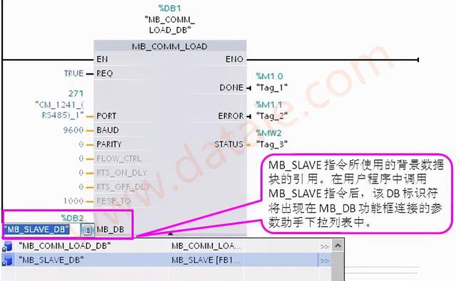 5调用MB_SLAVE指令 在OB1中调用MB_SLAVE指令, 调用该指令时会自动弹出创建相应背景数据块的界面,如下图8所示: