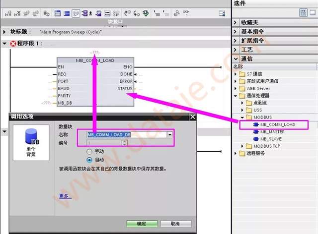 图5 调用MB_COMM_LOAD指令 点击“确认”为该指令创建背景数据块后,为各输入/输出引脚分配地址。尤其需注意MB_DB输入引脚需指向“MB_SLAVE”指令的背景数据块,如下图6所示: 注意:“MB_COMM_LOAD”指令输入位“REQ”需使用上升沿触发。由于OB 100只在S7-1200启动时执行一次,因此,此例中将“REQ”设为“TRUE”。