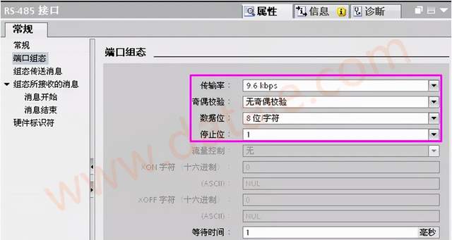 图1 组态通信模块 接下来,在“设备视图”中用鼠标选中CM1241(RS485)模块,在“属性”→“端口组态”中配置此模块硬件接口参数。如下图2所示: 以下以传输率=9.6Kbps,奇偶校验=无奇偶校验,数据位=8位字符,停止位=1,其它保持默认设置为例。