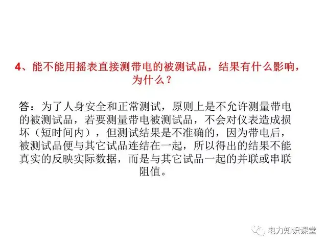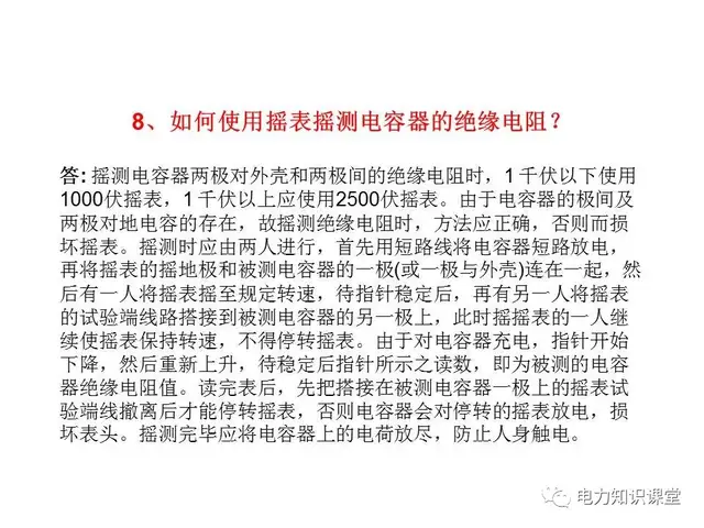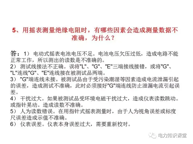10、摇测时,将摇表置于水平位置,摇把转动时其端钮间不许短路。摇测电容器、电缆时,必须在摇把转动的情况下才能将接线拆开,否则反充电将会损坏摇表。