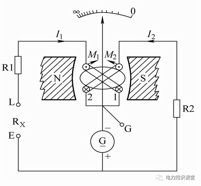 当以120转/分速度均匀摇动手柄时,表内的直流发电机输出该表的额定电压,在线圈1与被测电阻间有电流I1,在线圈2与表内附加电阻R2有电流I2,两种电流与磁场作用
