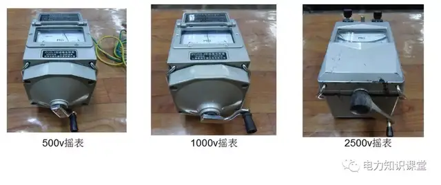 摇表也称兆欧表,主要用于测量电气设备的绝缘电阻。摇表的额定电压有500、1000、2500V等几种。