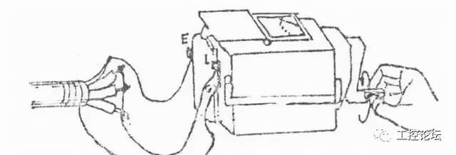 将摇表接线柱的(E)可靠接地,(L)接到被测线路上。按顺时针方向摇动摇表的发电机手把,转速由慢变快,转速达120/分钟匀速摇动,约一分钟后发电机转速稳定时,表针也稳定下来,这时表针指示的数值就是所测得的绝缘电阻值。测量方法如图所示。