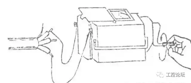 将摇表接线柱的(E)接机壳。(L)接到电机绕组上,以120转/分的速度摇动摇表手柄。指针稳定后读数。测量方法如图所示。