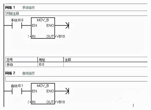 (17)PLC和上位机(或触摸屏)组成监控系统时,在画面上很多时候需要有“手动”、“自动”等控制模式(一般都是多个只能一个时)。在程序里面可以用“MOV”指令。如:当选择“手动”就将常数1 MOV到一个寄存器VB10里面,当选择“自动”就将2 MOV到同一寄存器VB10。只要判断寄存器的数据是多少,就知道系统是那种控制方式。这样的思路好处是容易理解,不需要互锁之类的麻烦程序。