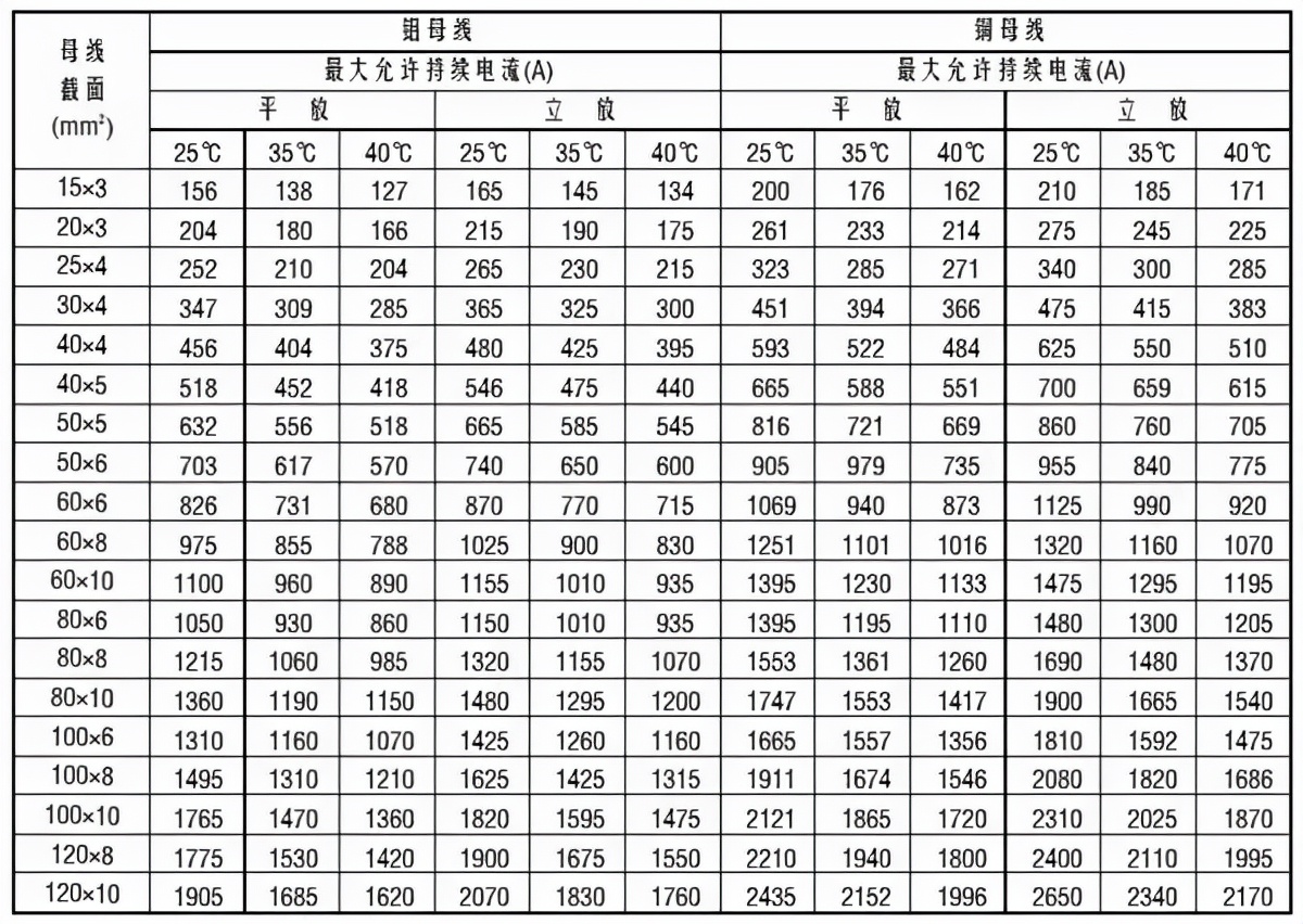 母排的载流量还与环境温度、多条母排并列、母排平放、竖放等因素有关。