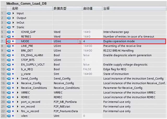 ②Modbus_Comm_Load指令背景数据块中的静态变量“MODE”用于描述PTP模块的工作模式,有效的工作模式包括: - 0 = 全双工 (RS232)