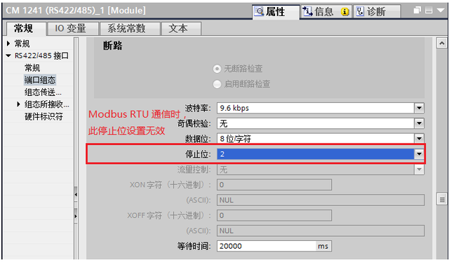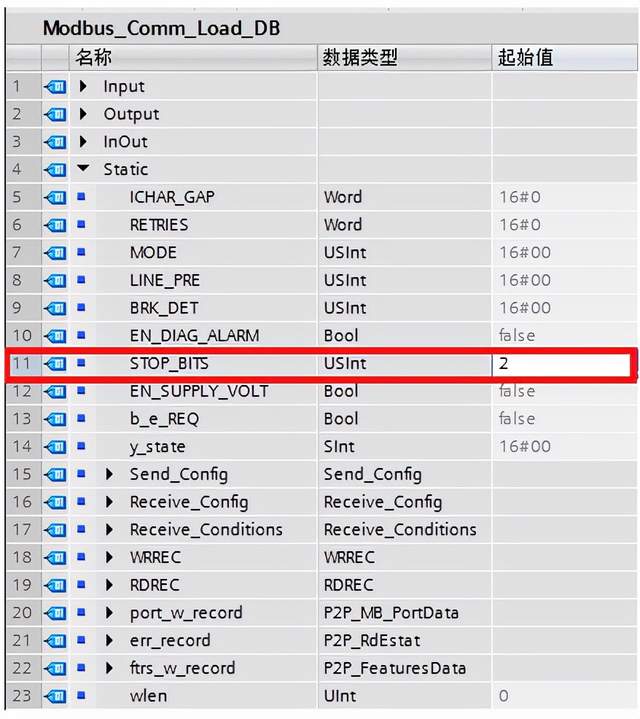 图2. CM1241 配置停止位参数 Modbus_Commload 指令的背景 DB 里 Static 修改 STOP_BITS停止位数值为 2(默认值=1)