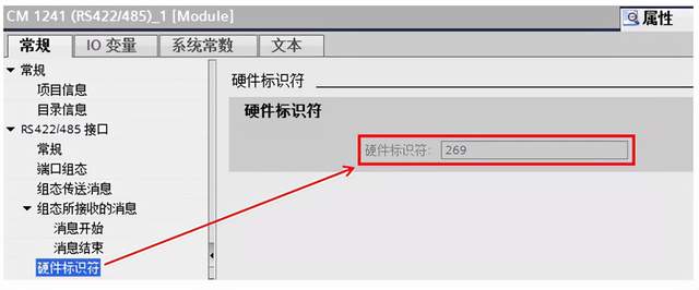 图5. CM1241 RS422/485 模块端口组态 (3)最后在“硬件标识符”里确认一下硬件标识符为269(该参数在程序编程中会被使用),如下图6所示: