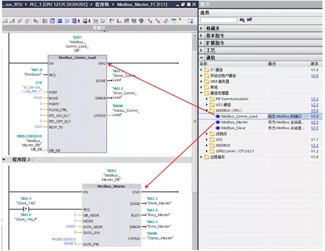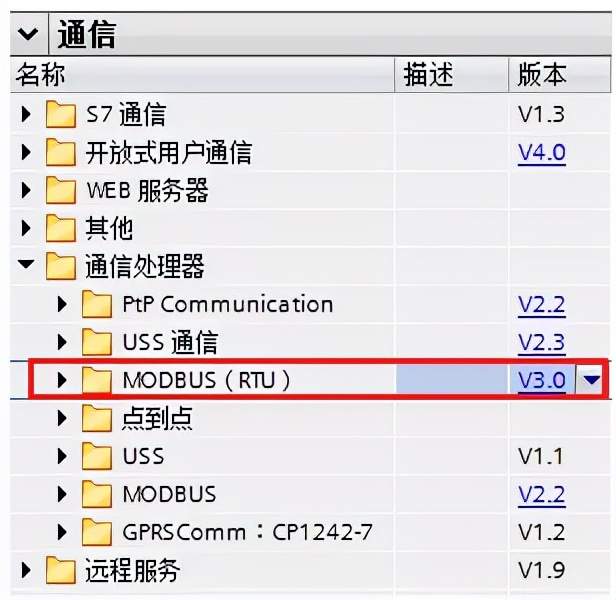 - 新版本的 Modbus RTU 指令(图1. 中 MODBUS(RTU) V3.0)扩展了 Modbus RTU 的功能,该指令除了支持 CM1241 通信模块、CB1241 通信板,还支持 PROFINET 或 PROFIBUS 分布式 I/O 机架上的 PTP 通信模块实现 Modbus RTU 通信。