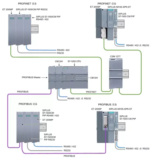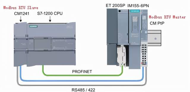 图2. 新版本 Modbus RTU指令所支持的PTP模块 (二)Modbus RTU指令实例环境介绍新版本Modbus RTU指令中包含Modbus RTU 主站指令和从站指令。本文以 CPU1217C+CM1241 RS422/485+ET200SP CM PTP 模块为例,介绍新版本 Modbus RTU 指令主从通信的编程步骤。其中CPU 机架CM1241 RS422/485作为Modbus RTU从站,分布式机架ET200SP 中 CMPTP 模块作为Modbus RTU主站。 1、网络结构图如下: