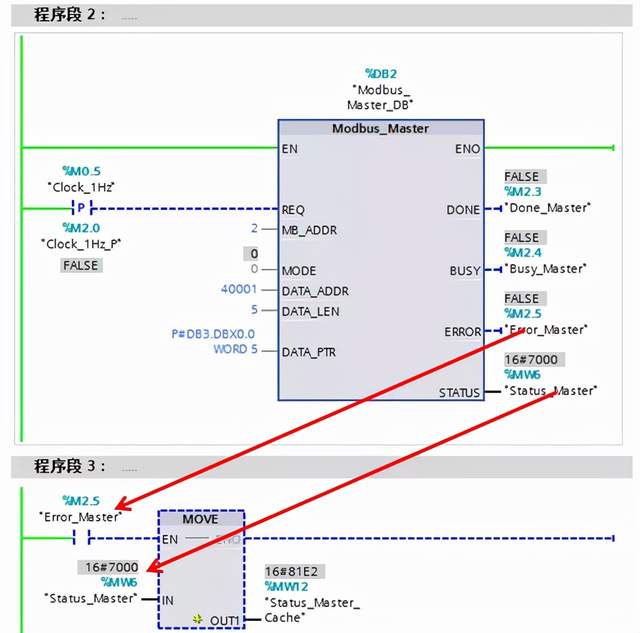 以Modbus_Master指令为例,当通信出现错误时,Modbus_Master指令的“ERROR”输出位将变为 TRUE 但是只保持一个扫描周期,所以通过TIA 软件程序监控时无法查询到错误。Modbus_Master指令“STATUS” 参数中的错误代码仅在“ERROR” = TRUE 的扫描周期内有效,为了获取了Modbus RTU通信错误的错误代码我们可以采用下图19. 方式编程。