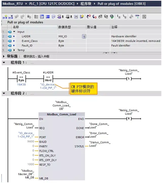 图14.Modbus_Master轮询调用方式 (2)插入"Pull or plug of modules" 中断OB83本例中Modbus RTU主站模块安装在分布式IO站点上,因此程序中需要考虑分布式IO站点故障、CM PTP 模块插拔模块等故障。分布式IO站点中插出、拔入模块时,操作系统都会调用一次OB83。通过OB83接口区的输入变量“16#Event_Class”判断故障的模块和类型:事件类型16#39表示模块被拔出,事件类型16#38表示模块被插入。CM PTP 模块被重新插入的时候,需要在中断OB83中调用Modbus_Comm_Load 指令对通信模块进行重新组态,如图15所示。