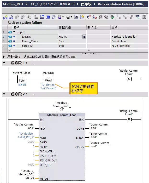 图16. 系统常量 (3)插入"Rack or Station failure" 中断OB86分布式IO站点故障和恢复时,操作系统都会调用一次OB86。通过OB86接口区的输入变量“16#Event_Class”判断故障的模块和类型:事件类型16#39表示站点故障,事件类型16#38表示站点恢复。CM PTP 模块所在的IO站点恢复时,需要在中断OB86中调用Modbus_Comm_Load 指令对通信模块进行重新组态,如图17所示: