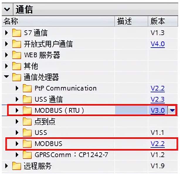 图1. 两个版本Modbus RTU指令 (1)早期版本的Modbus RTU指令(图1. 中 MODBUS (V2.2))仅可通过CM1241通信模块或CB1241通信板进行Modbus RTU通信。