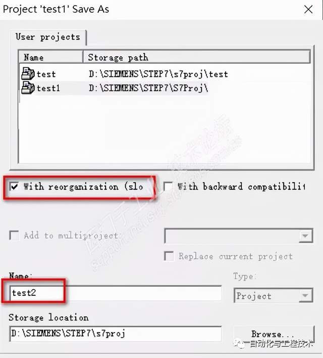 安装所需要的软件就可以对项目进行修改,但是不是所有的软件都比较容易找到。如果没有安装所需软件,可以通过重组的方式将与所需软件相关联的对象过滤掉,这样也可以对项目进行编辑和修改,操作步骤如下: (1) 点击项目,在菜单栏“文件”选项中选择“Save As”。 (2) 在弹出的对话框中,使能“With Reorganization...”选项并将项目另存一个项目名称,例如“test2”,如下图所示: