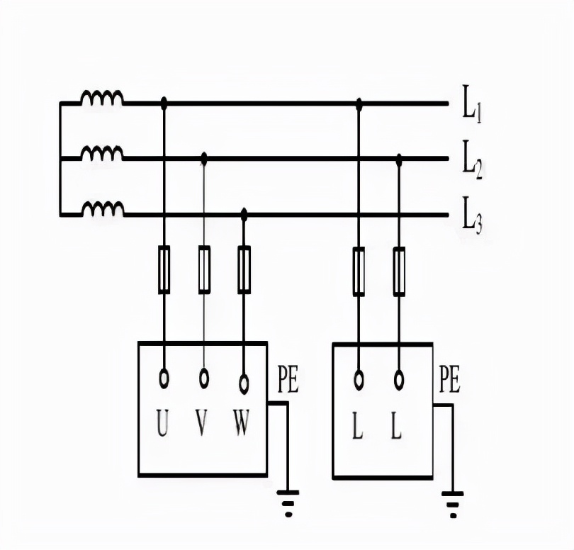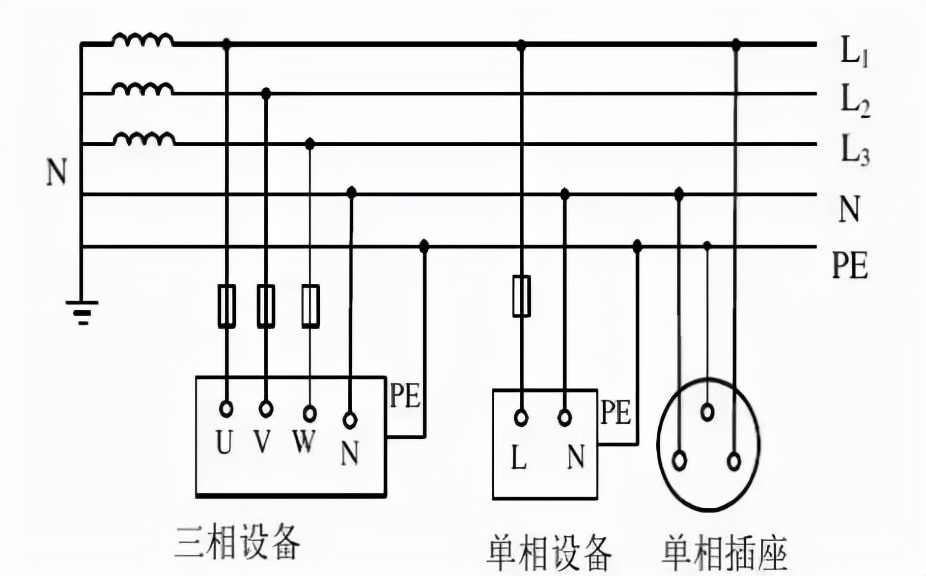 (1)、TN-S系统中性线N与TT系统相同。与TT系统不同的是,用电设备外露可导电部分通过PE线连接到电源中性点,与系统中性点共用接地体,而不是连接到自己专用的接地体,中性线(N线)和保护线(PE线)是分开的。
