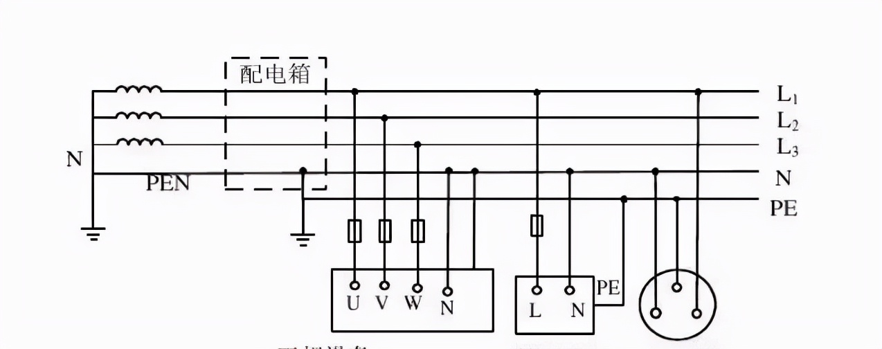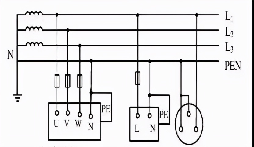 (1)、在TN-C系统中,将PE线和N线的功能综合起来,由一根称为PEN线的导体同时承担两者的功能。在用电设备处,PEN线既连接到负荷中性点上,又连接到设备外露的可导电部分。由于它所固有的技术上的种种弊端,现在已很少采用,尤其是在民用配电中,已基本上不允许采用TN-C系统。