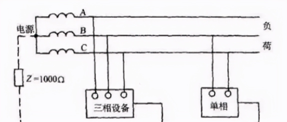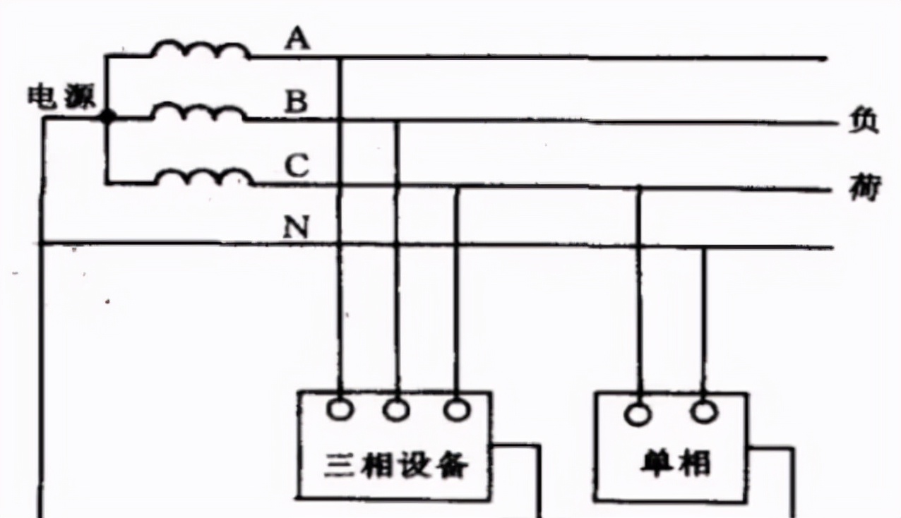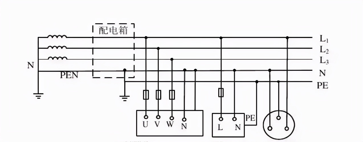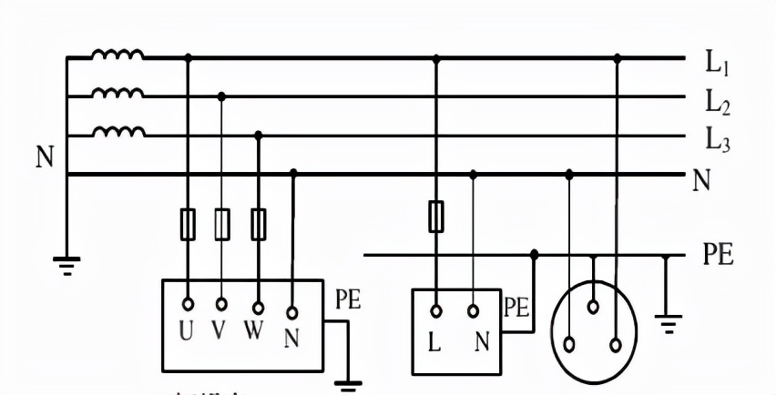 (2)、电源变压器中性点接地,保护零线(PE)与工作零线(N)共用(简称PEN),称为三相四线制系统。其中,中性线(N线)的作用: