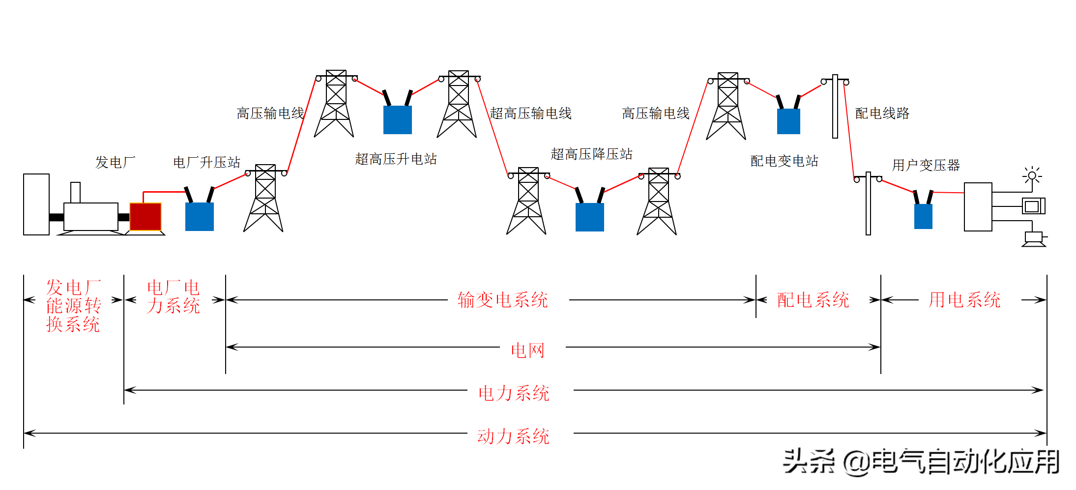 2、电力系统:由发电厂电力部分与电网所构成的一体化系统,叫做电力系统。
