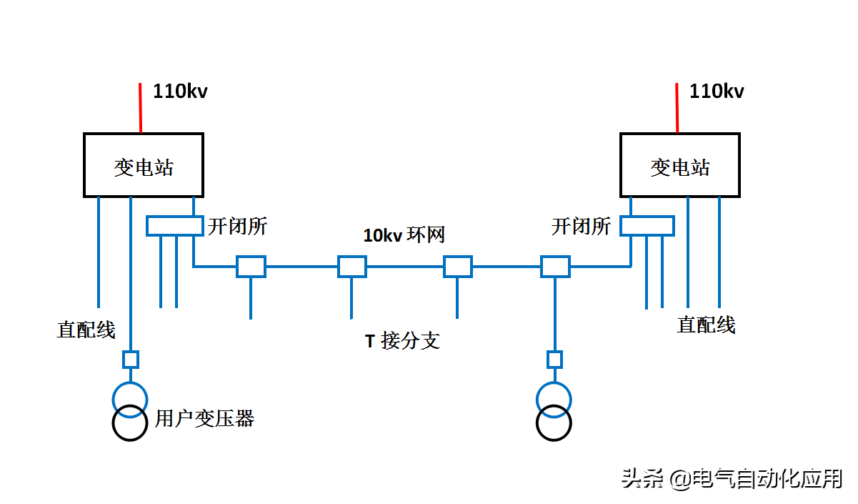 该系统有两个变电站,各出一路分支通过开闭所组成一个闭环供电网络;环网采用开环供电方式,具体由两侧的开闭所实现开环和供电的主、备用控制;环网中可有若干个T接线路为用户供电。同时,两个变电所分别可有若干个直配分支线路为专线用户供电。