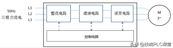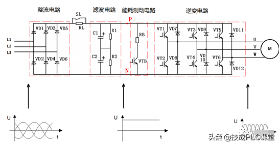 通用性变频器电路结构主要包括主电路和控制电路,其主电路如下图所示。主电路主要由整流电路、滤波电路、制动电路和逆变电路构成。