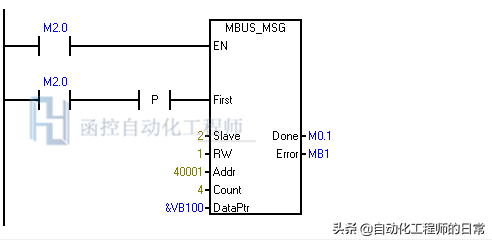 程序段4 当第一个启用标志 (M2.0) 接通时,调用 MBUS_MSG 指令。只需为启用该指令的第一次扫描设置 First 参数。 该指令会对从站 2 的 4 个保持寄存器执行写入 (RW = 1) 操作。从PLC中的 VB100-VB107(4 个字)获取写数据,然后写入到 Modbus 从站中的地址 40001 - 40004。