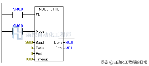 西门子PLC进行MODBUS通信主要使用单个主站及 MBUS_CTRL 和 MBUS_MSG 指令。 MBUS_CTRL:程序调用 MBUS_CTRL指令来初始化、监视或禁用 Modbus 通信。 MBUS_MSG:程序调用 MBUS_MSG指令,启动对 Modbus 从站的请求并处理响应。 程序编程及说明程序段1 通过在每次扫描时调用 MBUS_CTRL 来初始化和监视 Modbus 主站。Modbus 主站设为 9600 波特,无奇偶校验。从站设备允许在 1000 毫秒(1 秒)内进行响应。