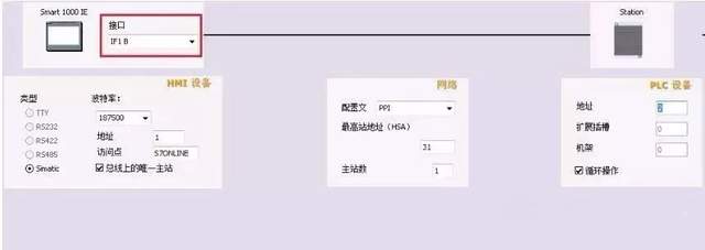 第四步:设置连接参数。首先选择Smart 1000 IE的接口为“IF1 B”,即触摸屏的RS422/485物理接口。选中该接口后,该接口的参数设置窗口将在其下方自动显示。设置触摸屏的通信波特率为187500,站地址为1。