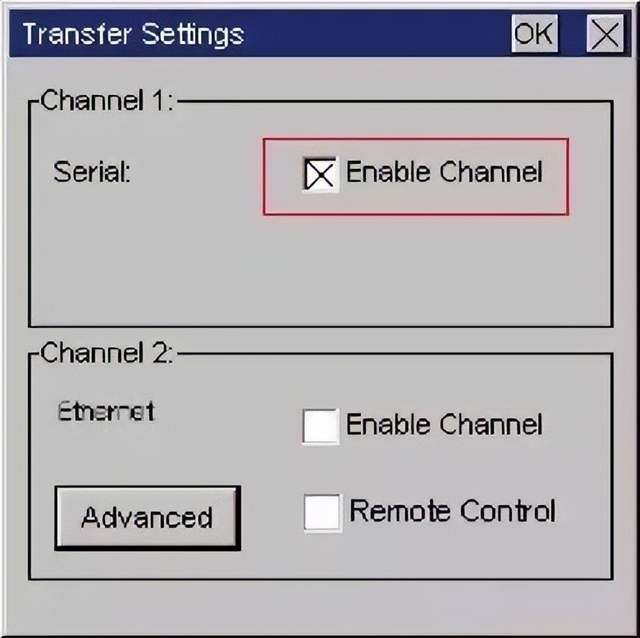 要将配置好的项目下载到Smart 1000 IE设备上,首先要保证HMI设备的通信口处于激活状态,可通过HMI设备的“Control Panel”>“Transfer”进行设置,如图9所示。如果选择串口方式下载项目,首先需要勾选“Serial”右侧的“Enable Channel”。