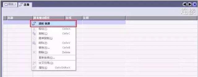 第二步:在“连接”窗口中双击名称下方的空白表格,或者右击鼠标选择快捷菜单中的“添加连接”可以添加与CPU的连接。如图4所示。