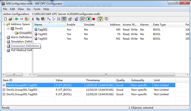 3.2 数据读取测试 选择monitor view,然后查看数据的读取情况,quality显示good即为通讯成功,如图