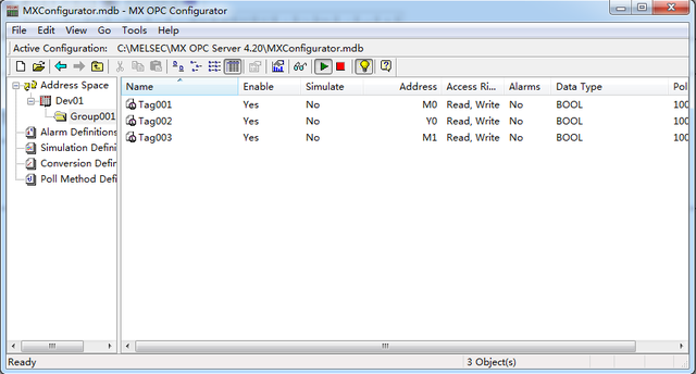 四、使用kepware读取MX OPC数据4.1 添加OPC 通道 创建新通道,添加OPC DA Client,然后分别关联M0、M1、Y0变量,如图