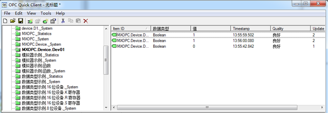 4.2 使用Quick client监视修改数据 打开Quick client,将M0变量值由0变为1,数据变化同时,监视程序也相应变化。