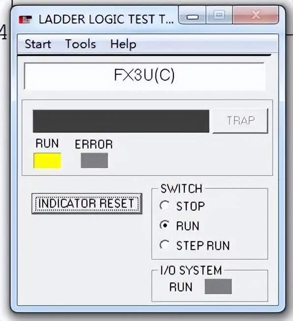 2.3 下载仿真运行程序 选择tools-start laader logic text,程序将下载到虚拟PLC中,下载完成PLC显示run模式。