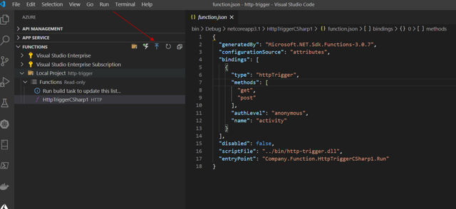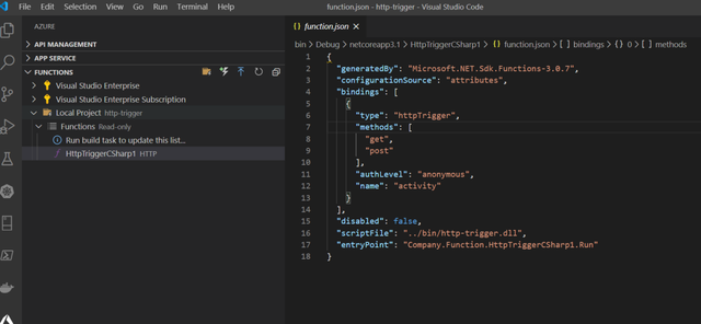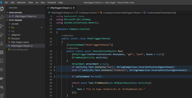 3. 查看项目内容。这里就是简单的api function,接受Activity请求模型(微软的Bot Framework),并标记了function的trigger类型是httptrigger,认证级别也是匿名的,这样在call这个api的时候就不需要提供token了。当然实际情况是需要有token验证的,这里不多介绍。